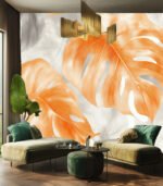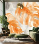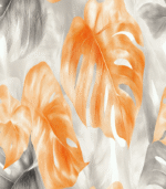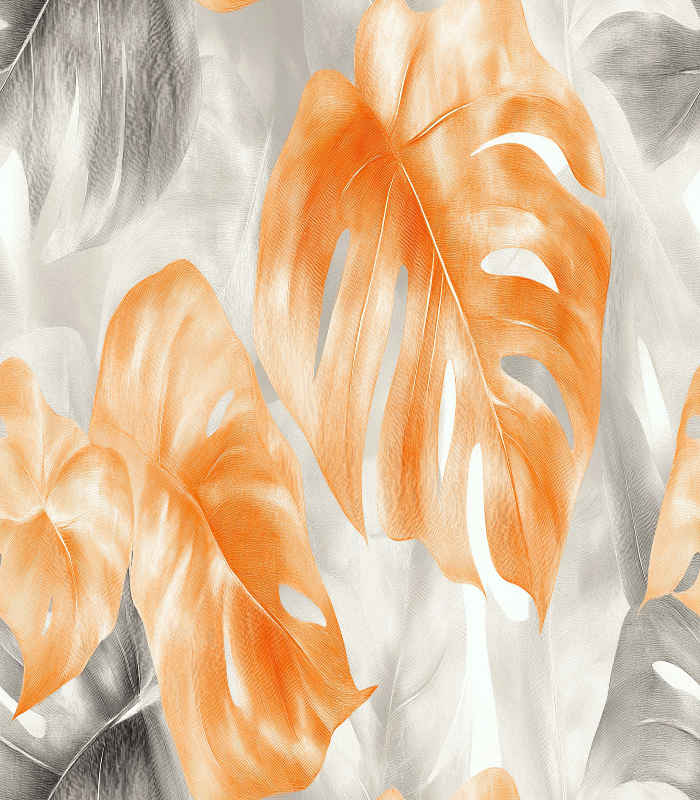 Abstract illustration of large orange and gray monstera leaves overlapping on a textured background, creating a vibrant and artistic botanical pattern.