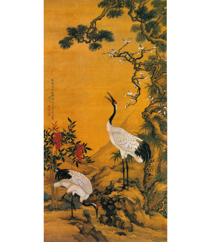 Serene autumn scene with delicate trees, golden leaves, and a crescent moon. Two birds perch quietly, embracing the tranquil evening ambiance.