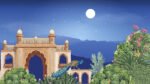 A majestic arched palace stands under a glowing full moon, with a peacock resting among lush garden foliage.
