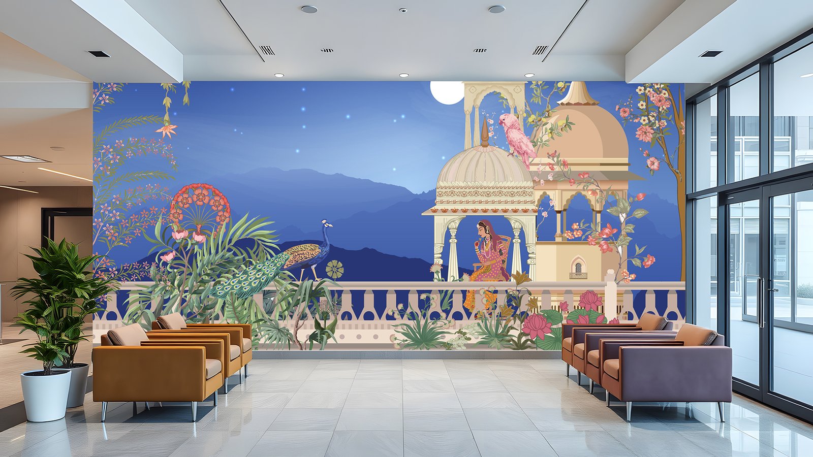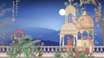 A graceful woman sits beneath ornate domes in a starlit garden, accompanied by a peacock and blooming florals under the glowing full moon.