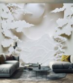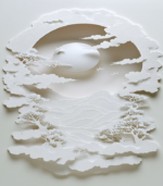 Intricate paper art depicting a serene landscape with mountains, trees, and birds under a full moon, all crafted in delicate white layers.