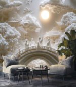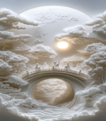 Intricate paper art depicts a serene landscape with figures on a bridge, under a glowing moon, surrounded by clouds and traditional architecture.