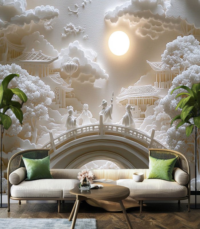 Intricate paper art depicts a serene landscape with figures on a bridge, under a glowing moon, surrounded by clouds and traditional architecture.