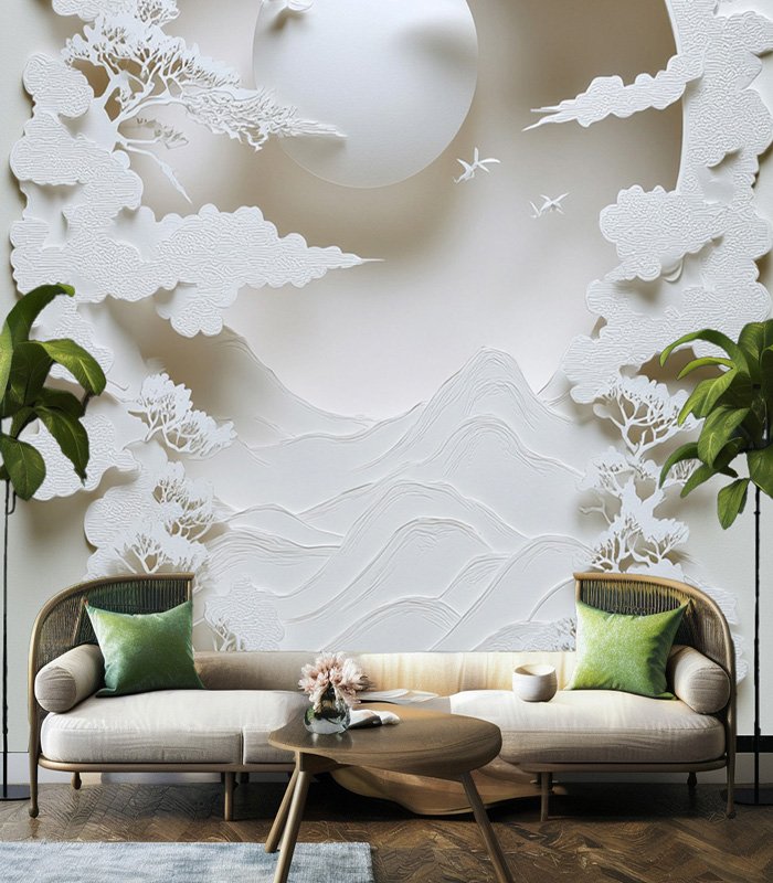Intricate paper art depicting a serene landscape with mountains, trees, and birds under a full moon, all crafted in delicate white layers.