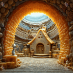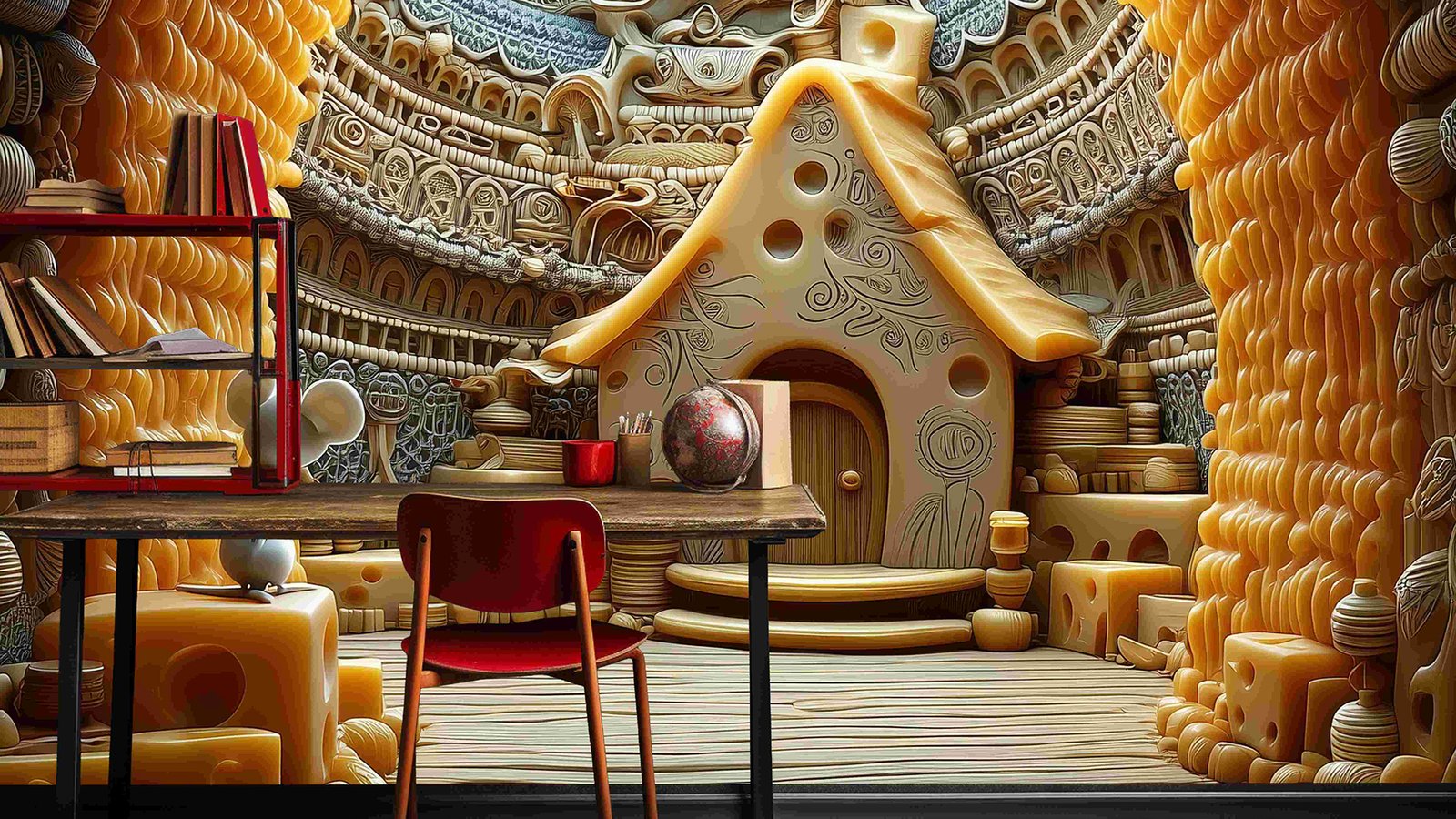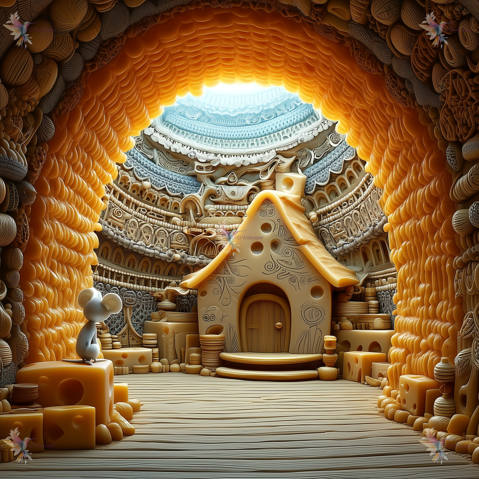 A small mouse sits on a cheese block in a whimsical cheese-themed interior with a cozy house.