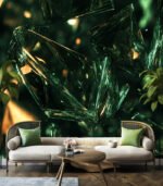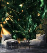 Glowing green crystals suspended in darkness, reflecting light with hints of orange, creating a mysterious and magical atmosphere in an ethereal space.