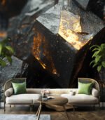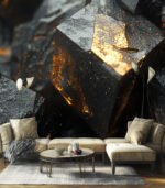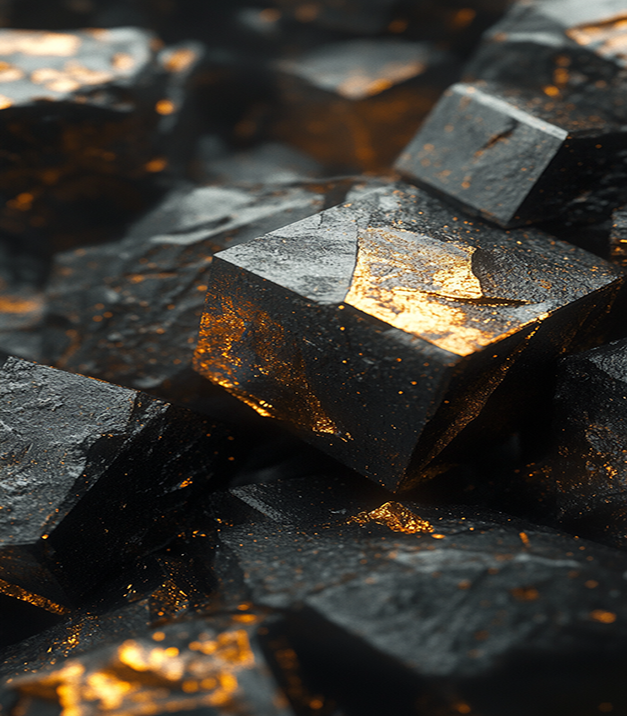 Close-up of dark, geometrically shaped crystals with golden flecks, creating a mysterious and luxurious texture reminiscent of a mystical, mineral-rich cavern.