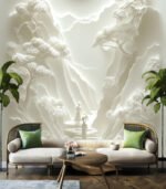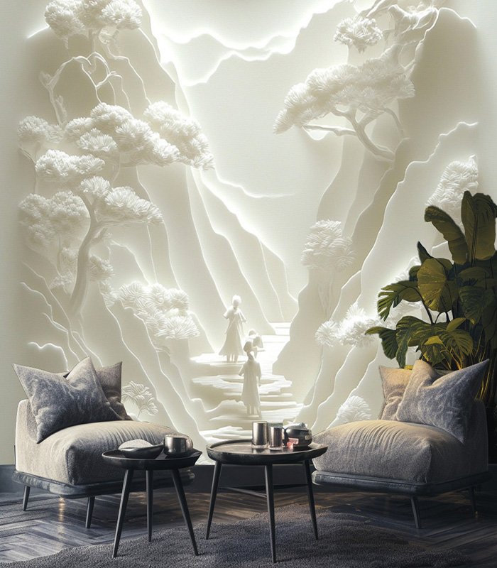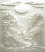 Intricate paper art depicts serene figures walking through a mystical landscape of mountains, trees, and clouds under a large sun, evoking tranquility and wonder.