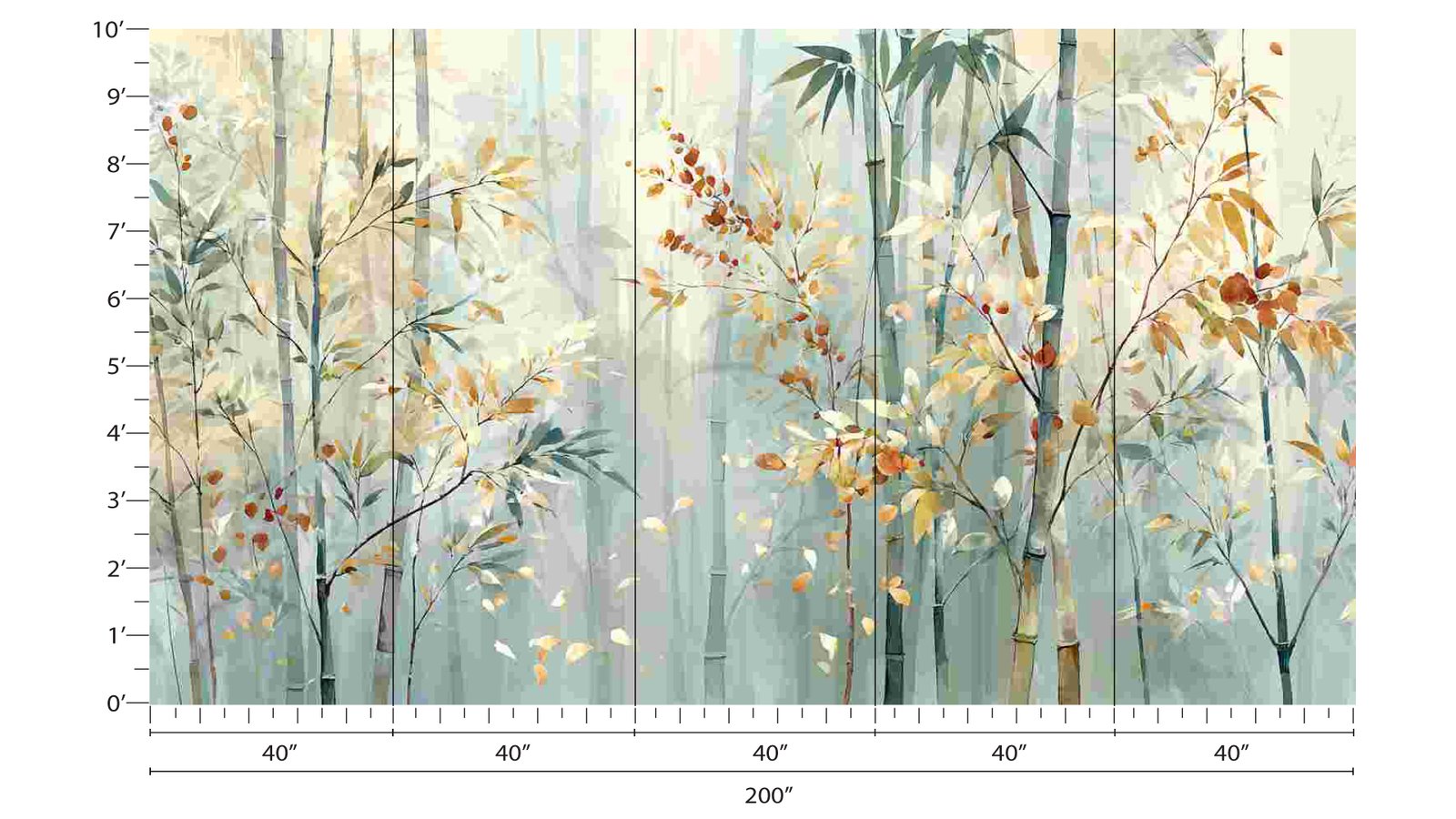 Artistic depiction of bamboo stalks and leaves with autumn colors, creating a serene and natural atmosphere.