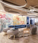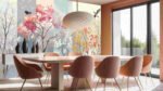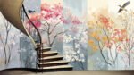 Colorful trees with blossoms and two birds flying and perched, set against a segmented background.