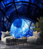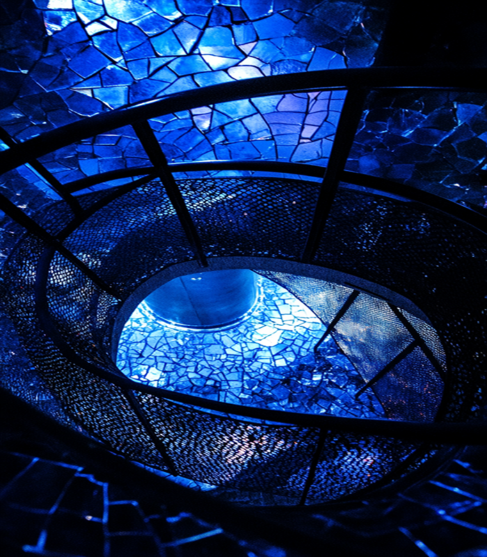 A spiral staircase with intricate metalwork and vibrant blue mosaic tiles creates a mesmerizing, otherworldly atmosphere, evoking a sense of mystery and wonder.