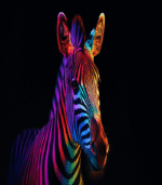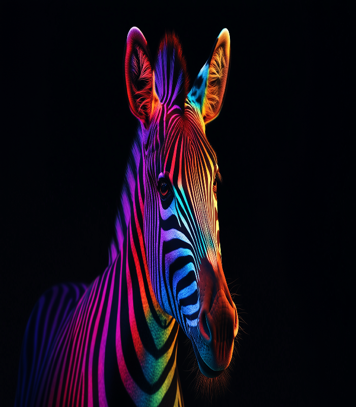 A zebra illuminated in vibrant neon colors stands against a dark background, showcasing a stunning blend of art and nature’s beauty.