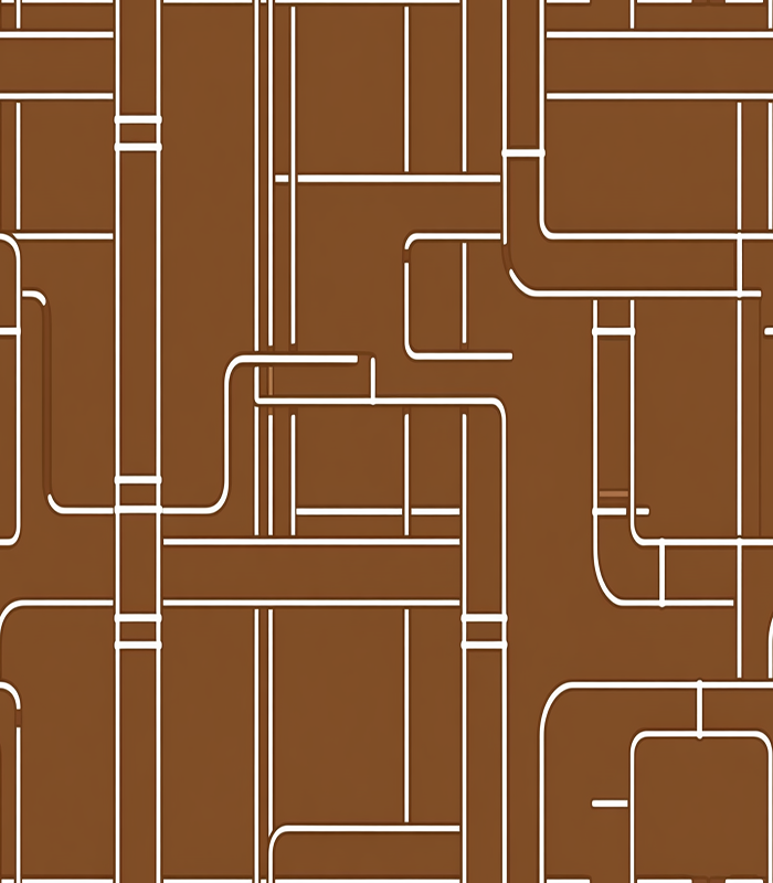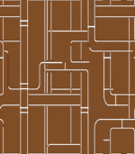 Abstract geometric pattern with interconnected white lines on a brown background, resembling a complex network of pipes or pathways.