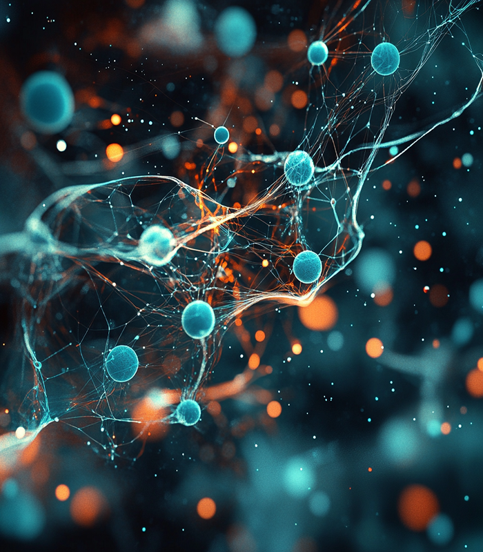 A vivid depiction of neural or cellular networks, showcasing interconnected nodes with glowing blue and orange hues, symbolizing complex biological or digital systems.