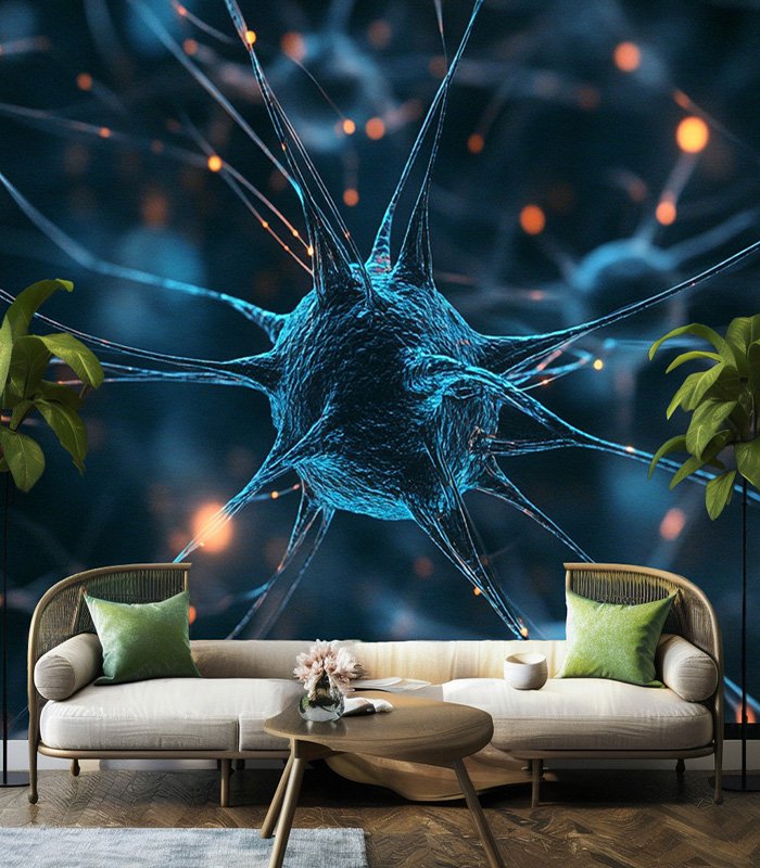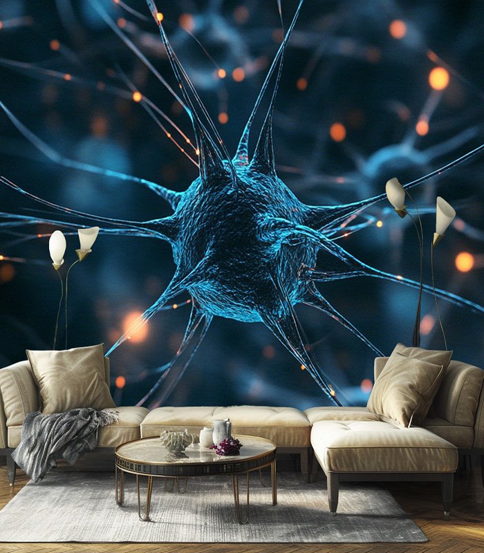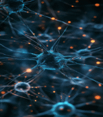 A vivid depiction of neurons interconnected by synapses, highlighted with orange nodes, illustrating the complex and dynamic nature of the human brain’s neural network.