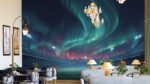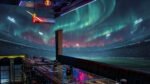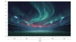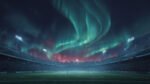 A vibrant stadium scene illuminated by northern lights with a large crowd and bright floodlights.