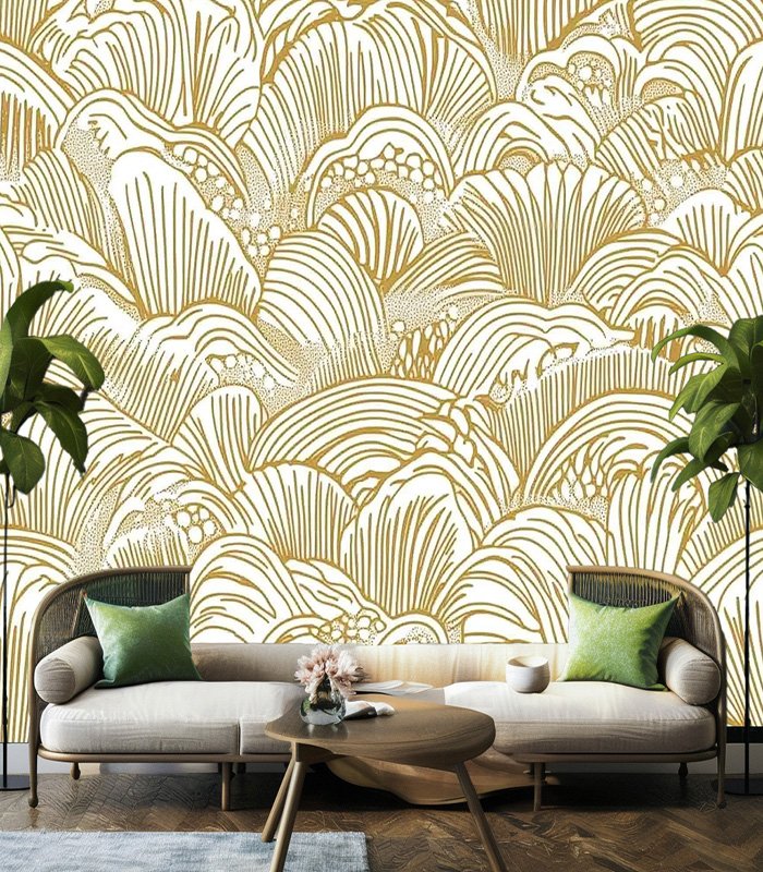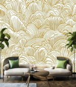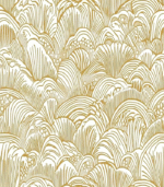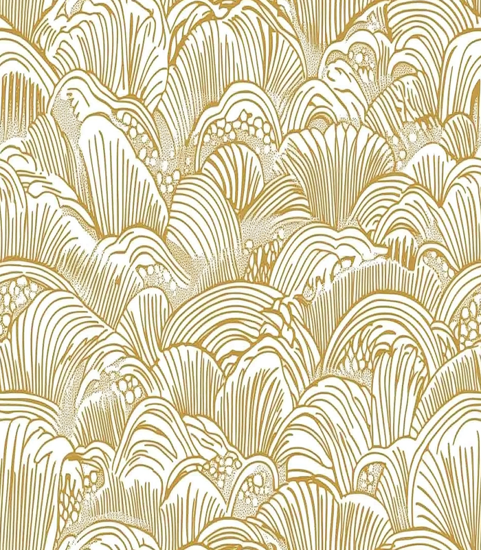 Intricate gold and white pattern featuring abstract, flowing lines and shapes, resembling waves or shells, creating a harmonious and elegant design.