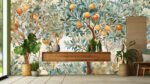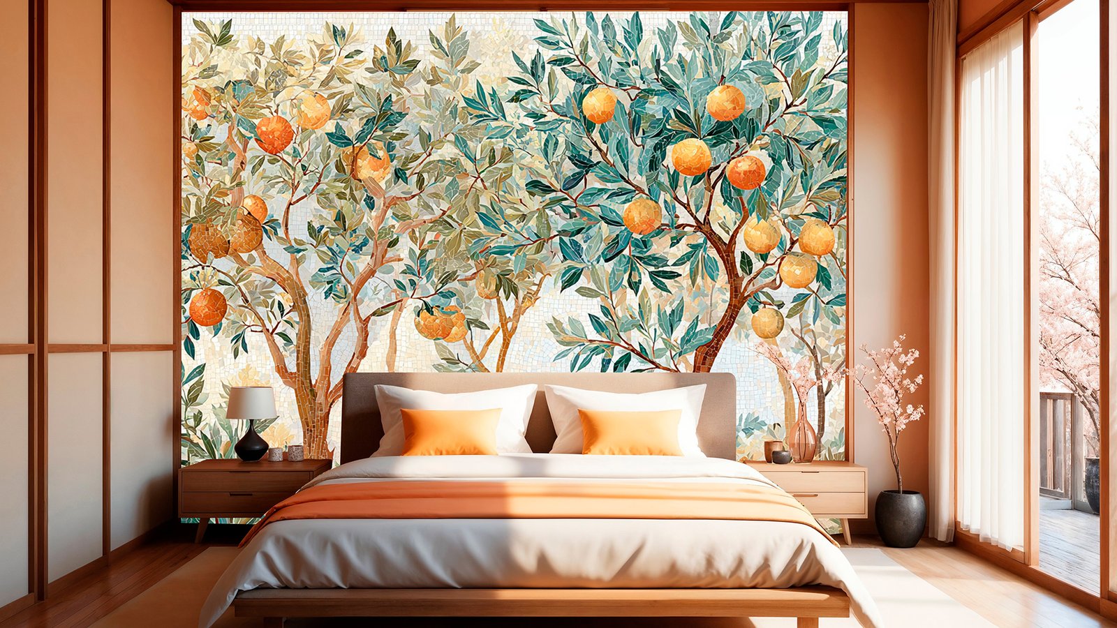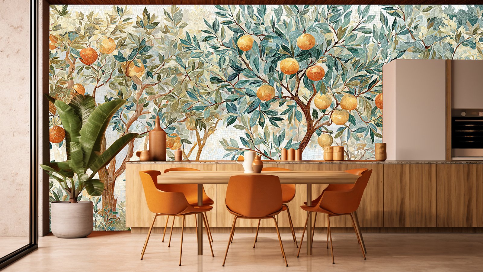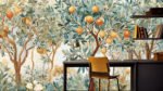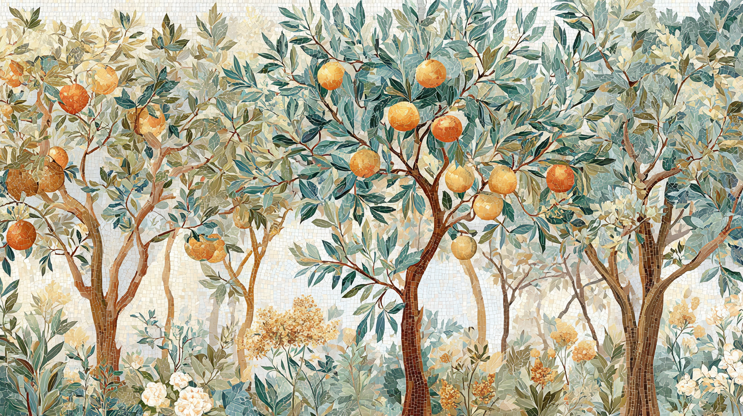A decorative scene featuring orange trees with ripe oranges and lush green leaves, surrounded by various plants and flowers.