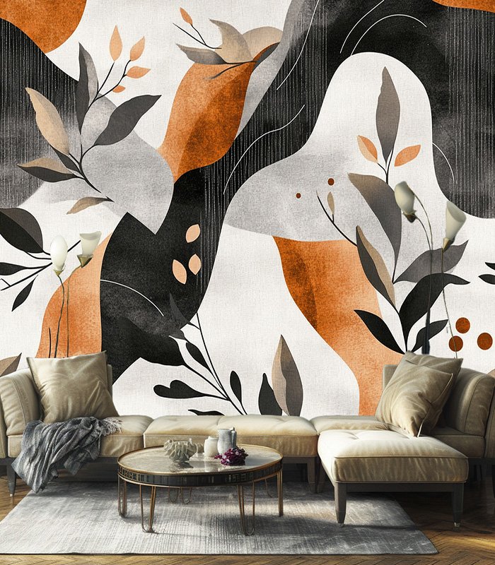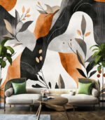 Abstract botanical illustration with flowing shapes and earthy tones, featuring leaves and organic forms in black, orange, and beige on a textured background.