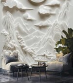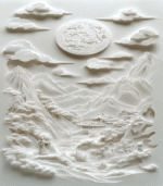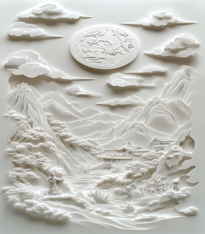 Intricate paper art depicting a serene mountain landscape with traditional architecture, trees, and clouds, all in delicate white layers.