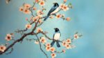 Two blue songbirds sing from flowering branches adorned with warm peach blossoms against a clear, tranquil sky.