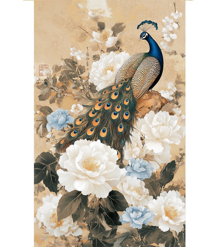 A majestic peacock perches gracefully among blooming peonies, showcasing its vibrant plumage in a serene, traditional Asian art style.