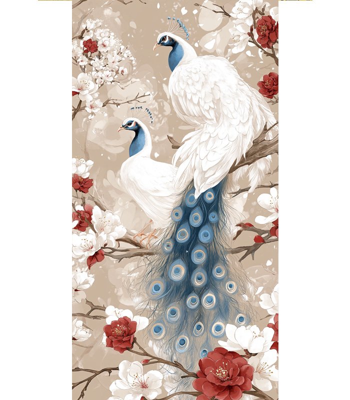 Two elegant white peacocks perched on blossoming branches, surrounded by vibrant red and white flowers, creating a serene and artistic nature scene.