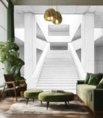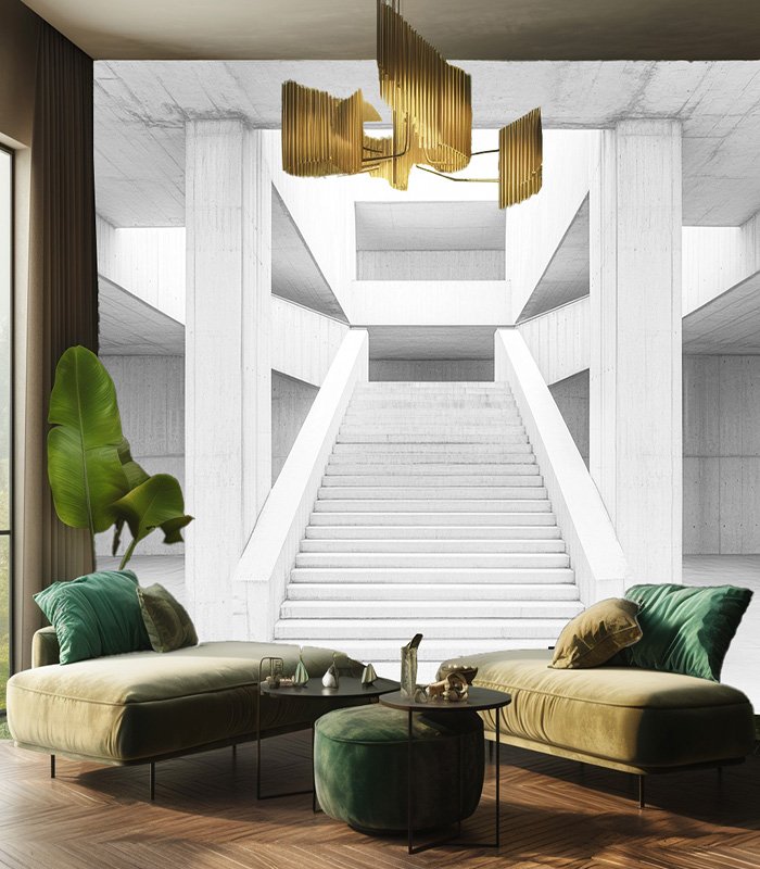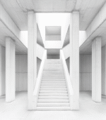 Symmetrical concrete staircase ascends between towering pillars, creating a minimalist architectural scene with clean lines and a serene, monochromatic atmosphere.