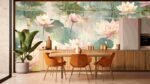 Multiple pink lotus flowers with green leaves floating on a serene water surface.