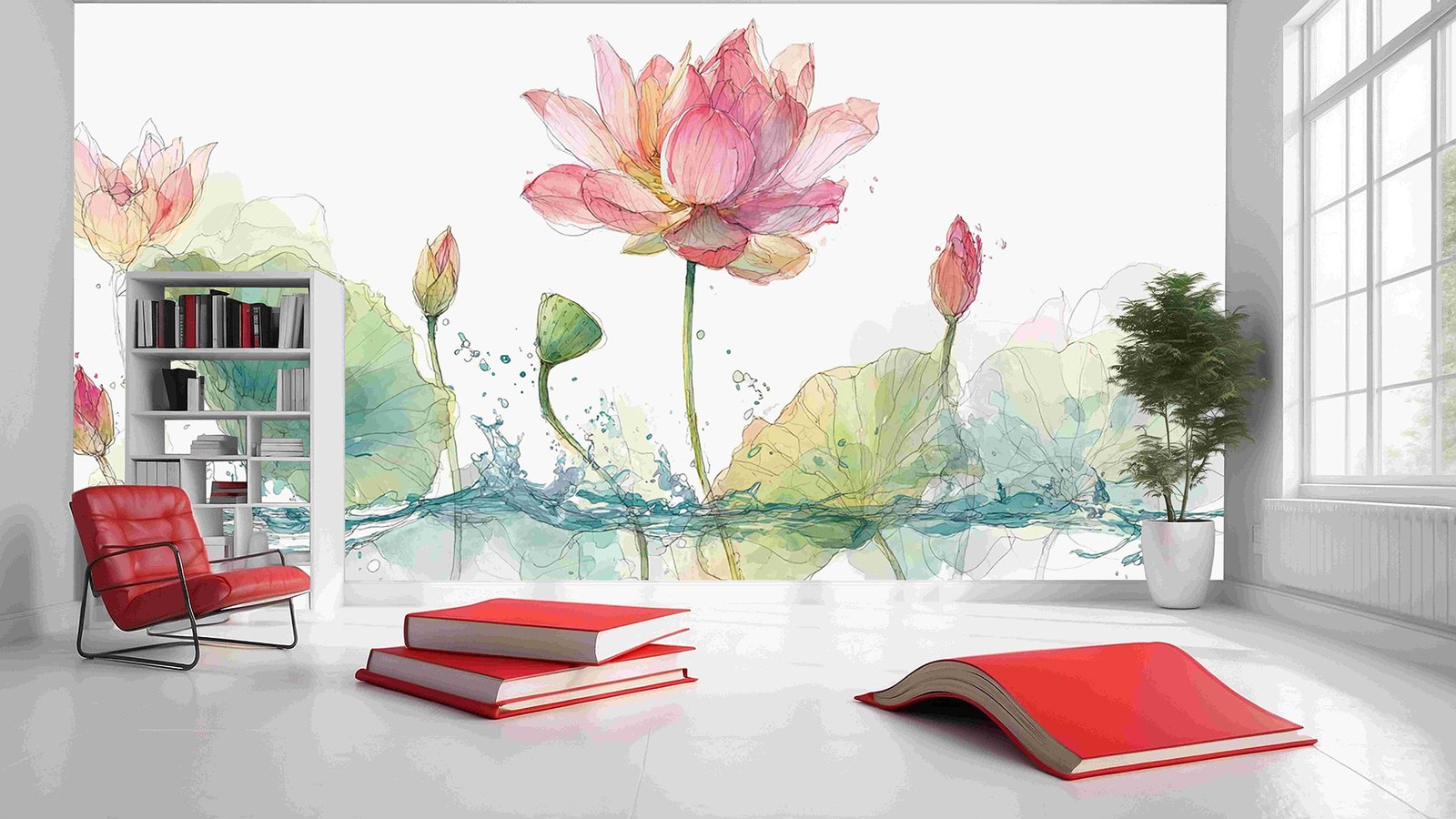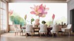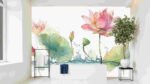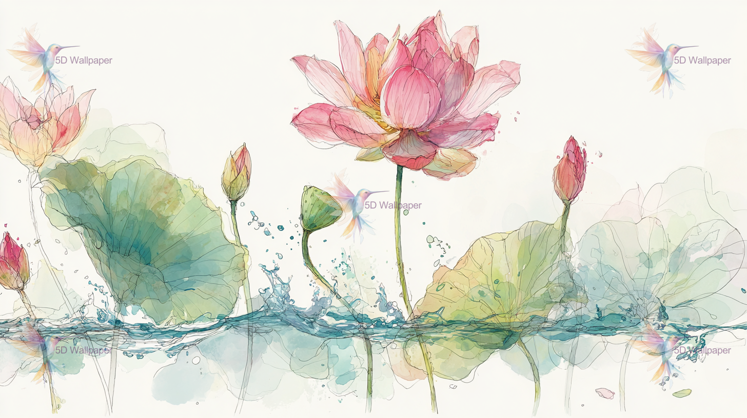 Several pink lotus flowers with green leaves and water splashes in a soft watercolor style