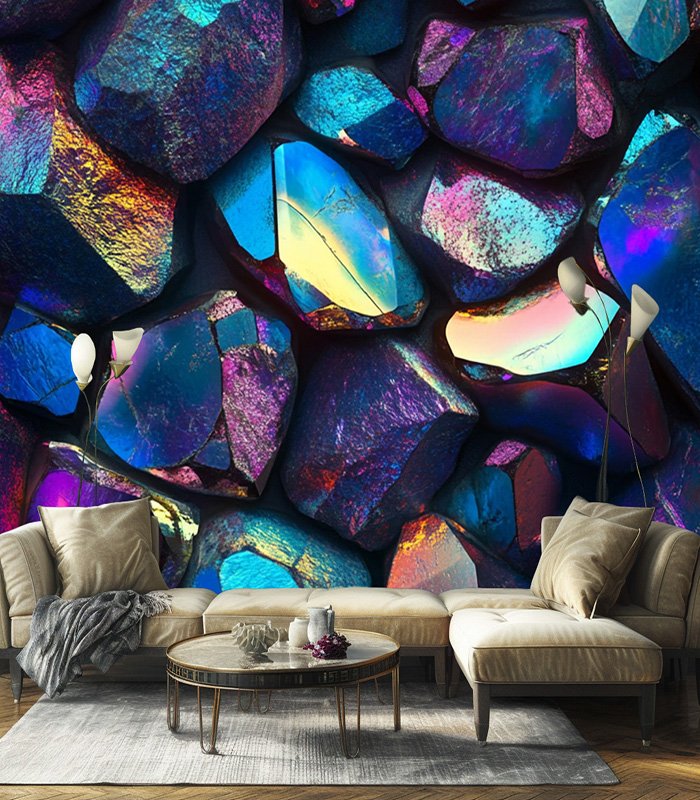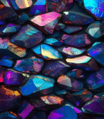 A vibrant collection of iridescent mineral pieces, showcasing a mesmerizing spectrum of blues, purples, and pinks with a shimmering metallic sheen.