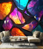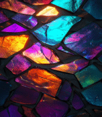 A vibrant mosaic of stained glass pieces in a kaleidoscope of colors, illuminated and fragmented, creating a dynamic and visually captivating texture.