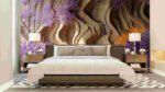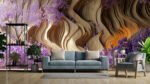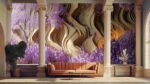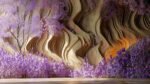 A stylized scene featuring a purple flowering tree against a wavy textured background.