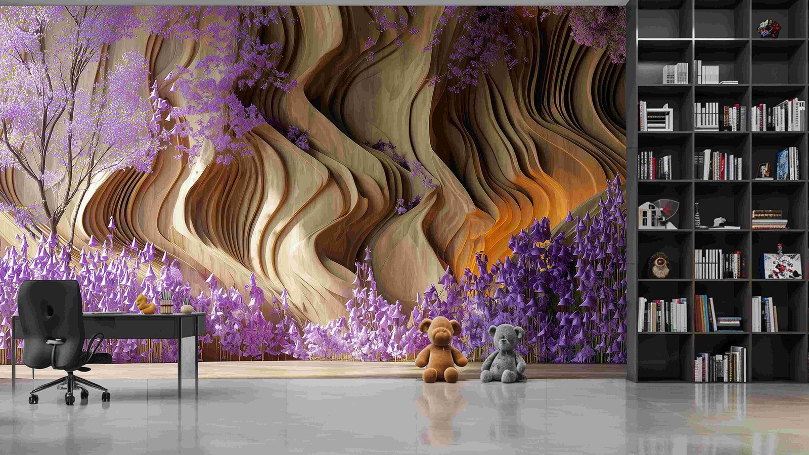 A stylized scene featuring a purple flowering tree against a wavy textured background.