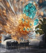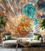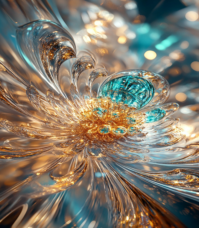 A mesmerizing close-up of a glass sculpture, showcasing intricate details and a radiant burst of golden and blue hues, evoking a sense of dynamic motion.
