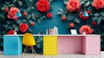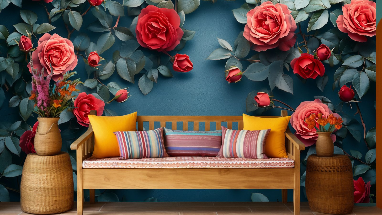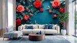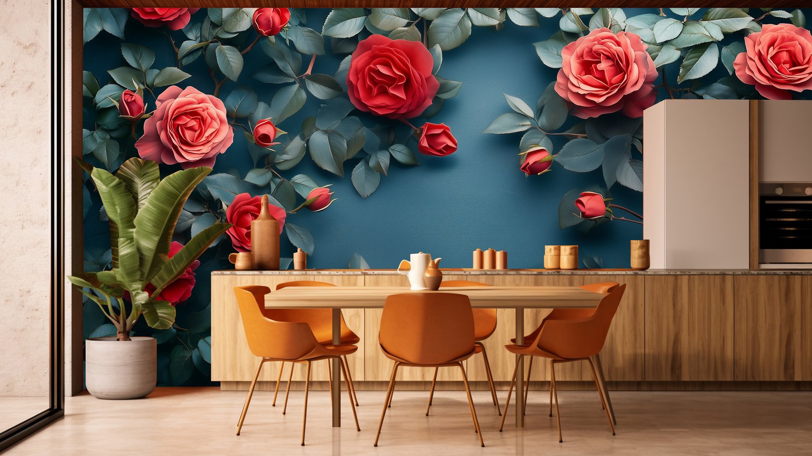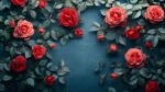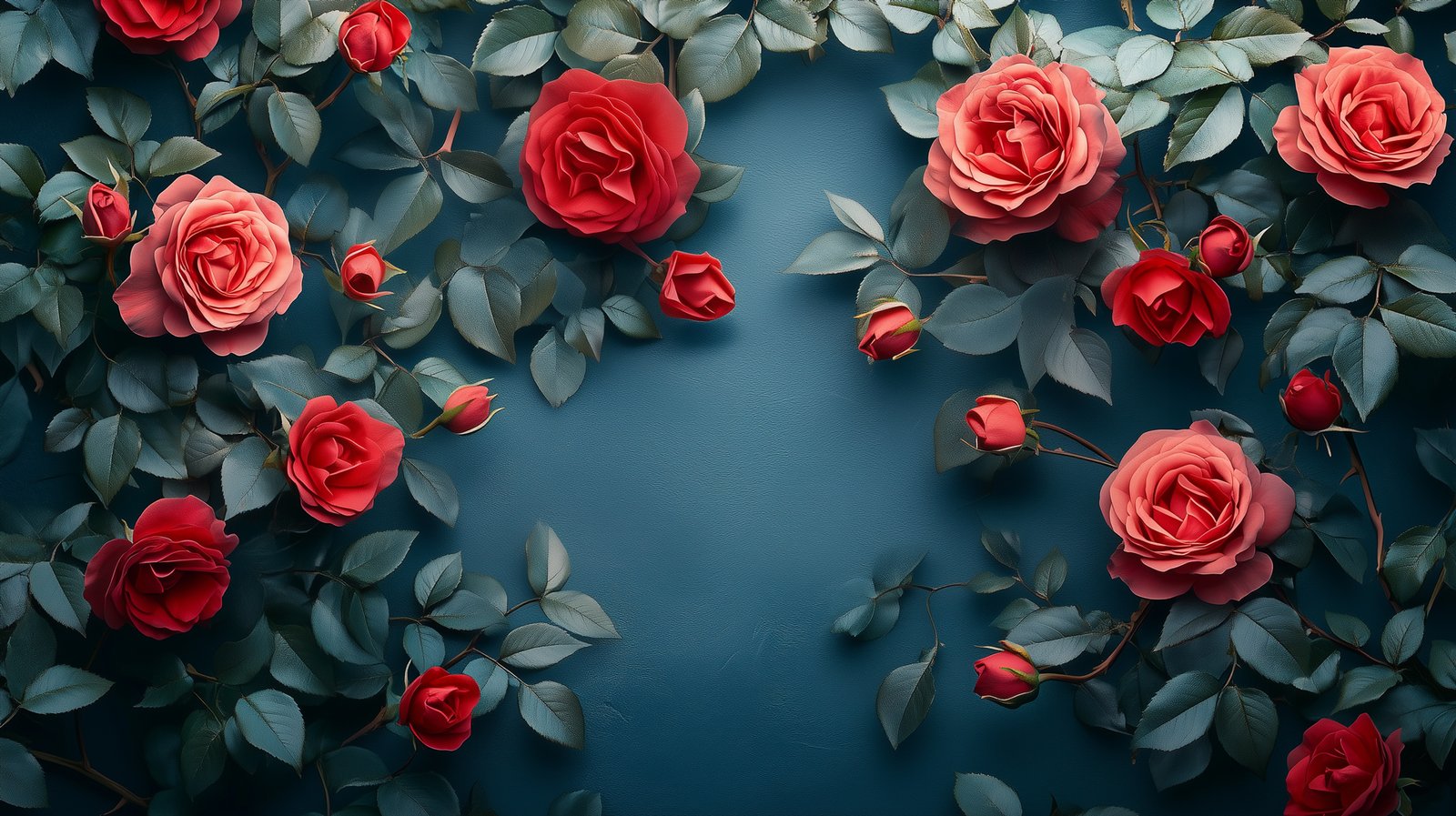 A collection of vibrant red roses surrounded by green leaves on a blue background.