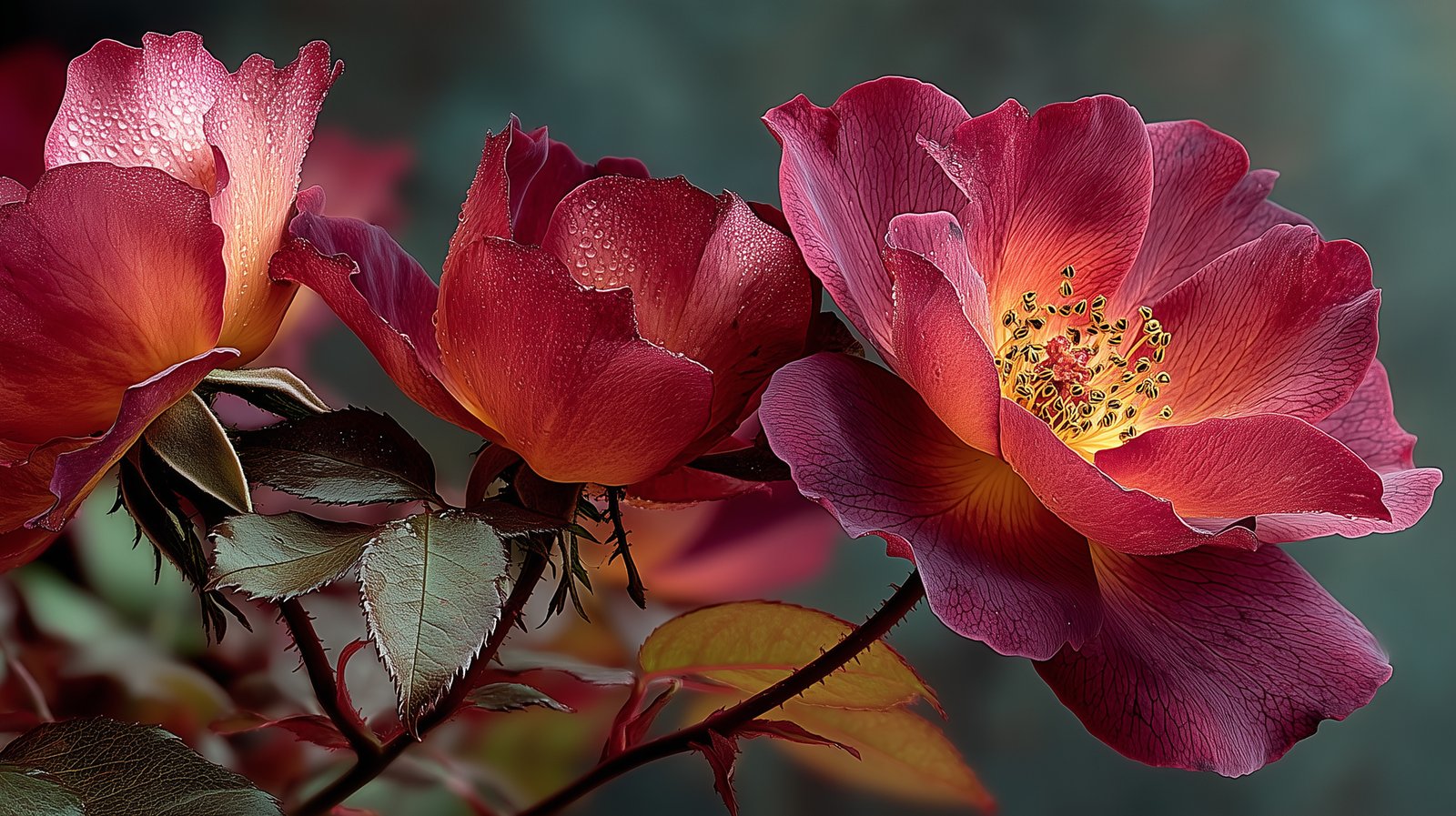 Three vibrant red roses with petals showing dew drops and green leaves.