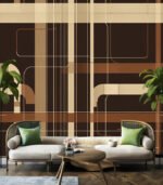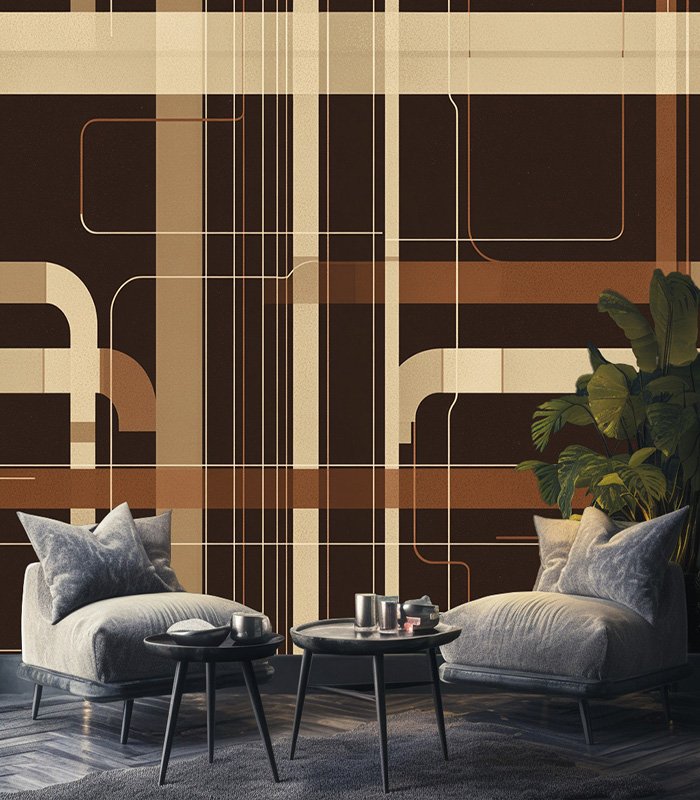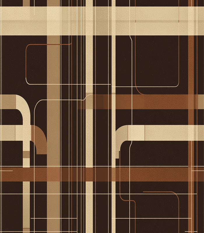 Abstract geometric design with intersecting lines and curves in shades of brown and beige, creating a retro, grid-like pattern on a dark background.
