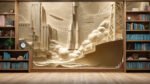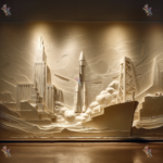 A wall mural depicting rockets, skyscrapers, and a ship in a stylized, abstract design.