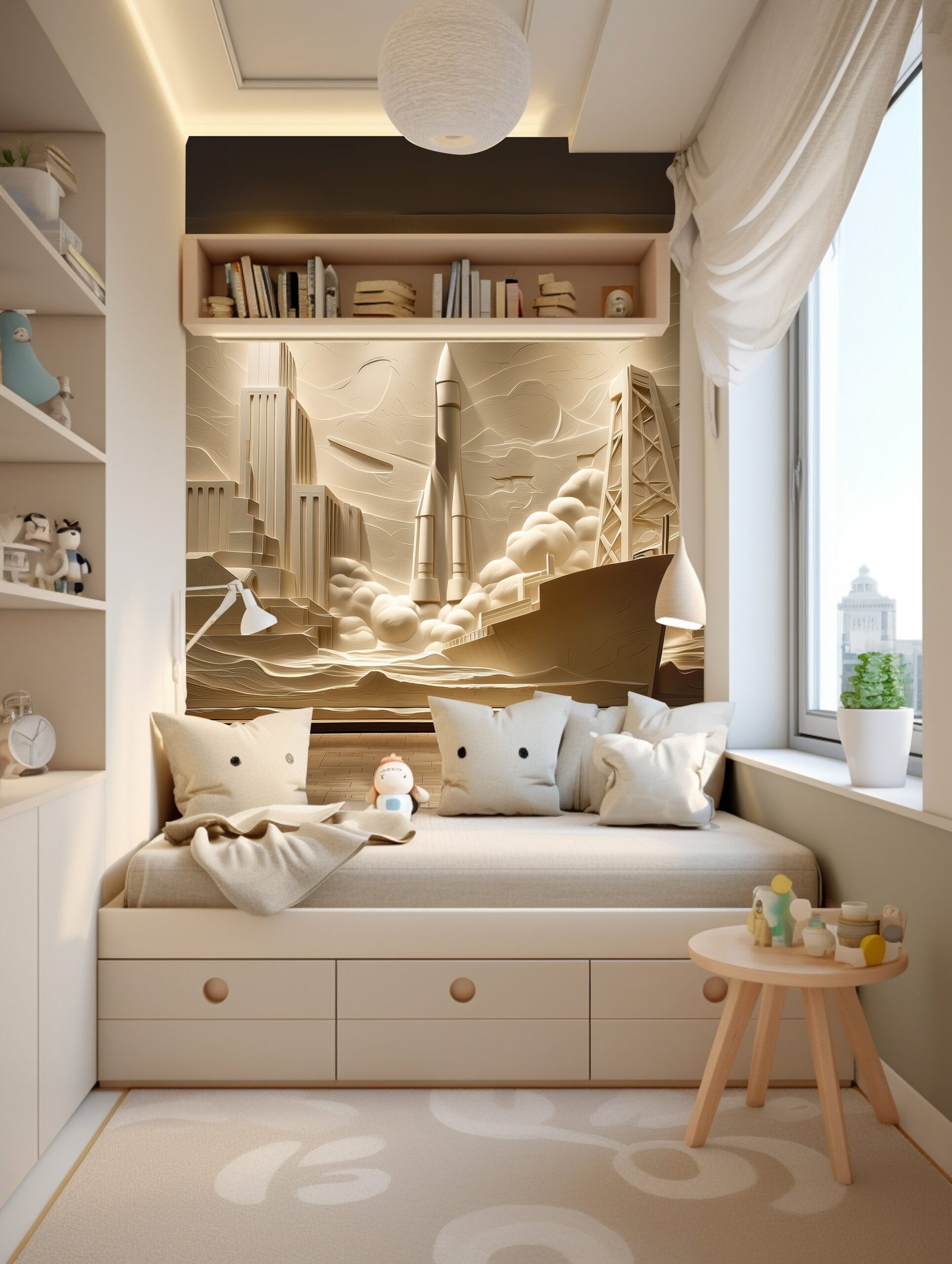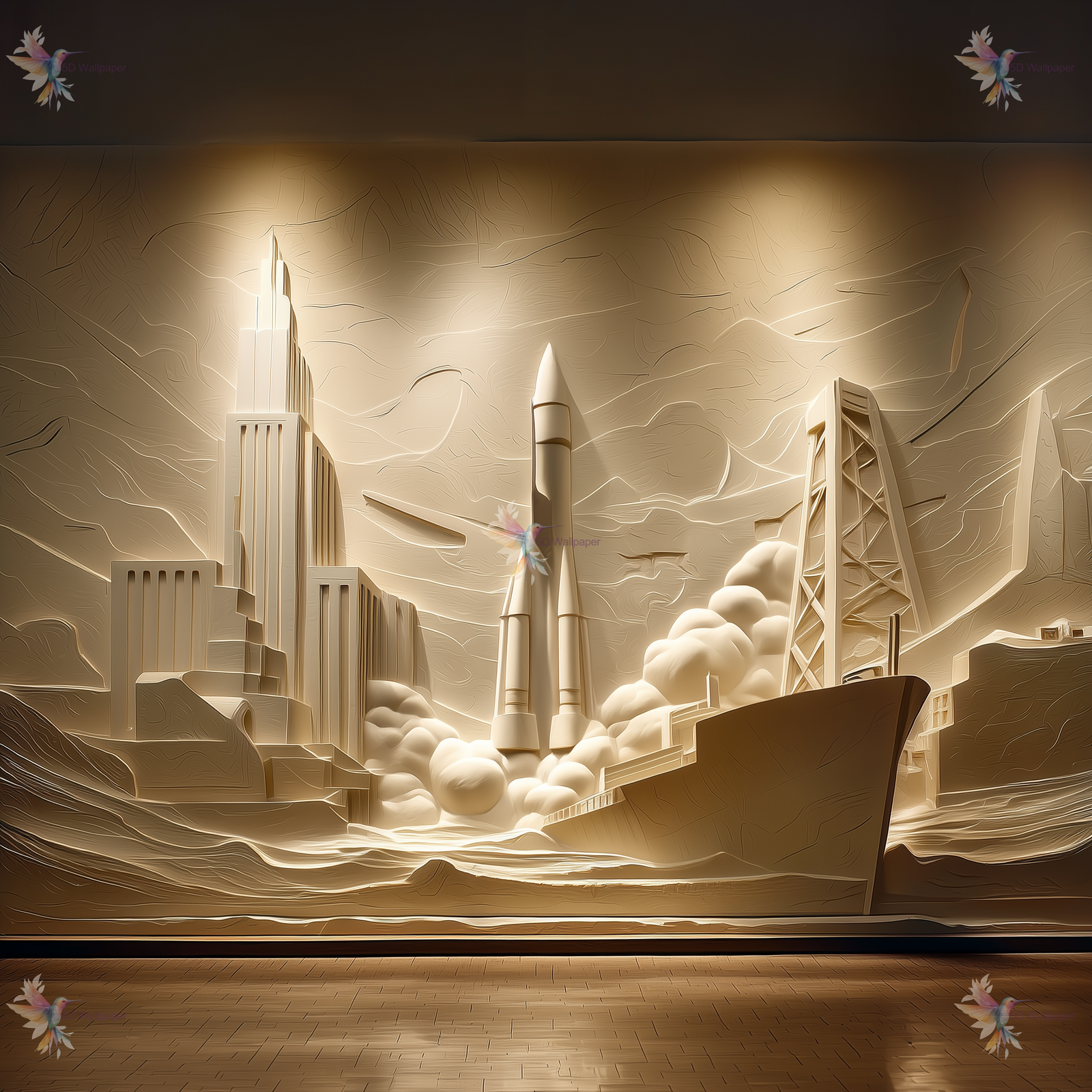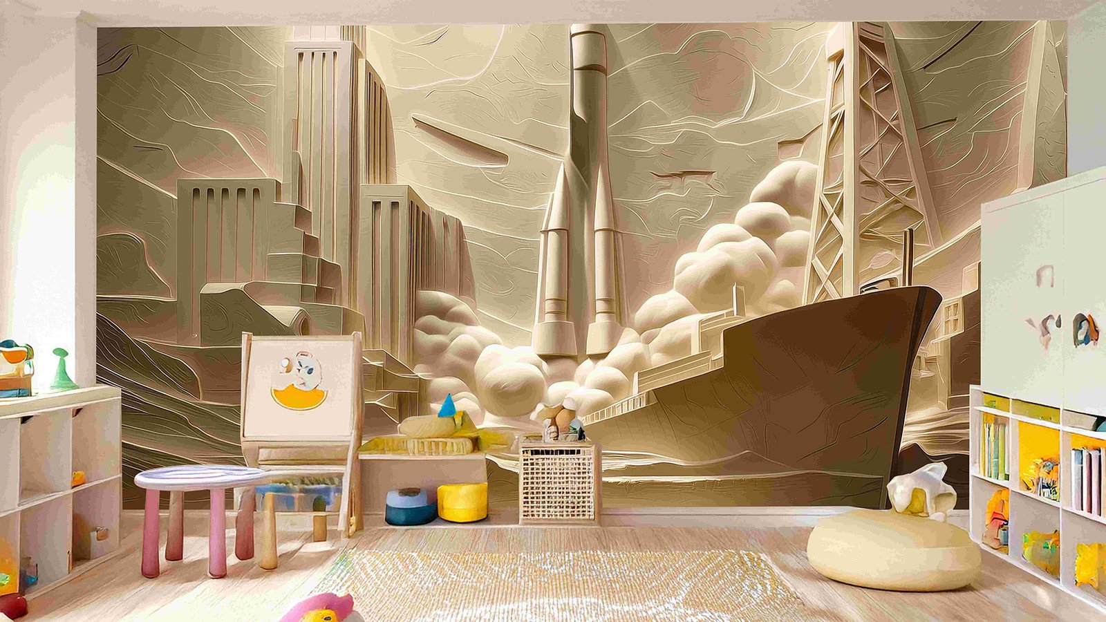 A wall mural depicting rockets, skyscrapers, and a ship in a stylized, abstract design.