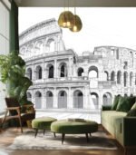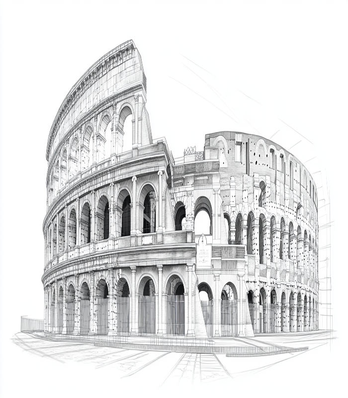 Intricate architectural sketch of the Colosseum, showcasing detailed arches and columns, capturing the grandeur of ancient Roman engineering and design.