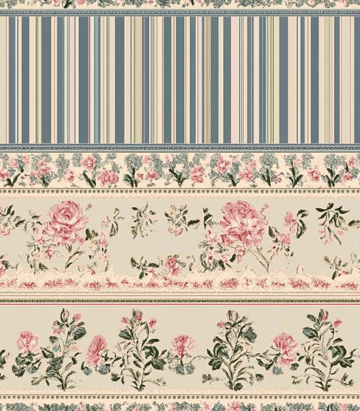 Vintage wallpaper design featuring elegant pink roses and green leaves, interspersed with blue and beige stripes, creating a classic, timeless aesthetic.