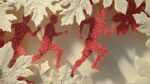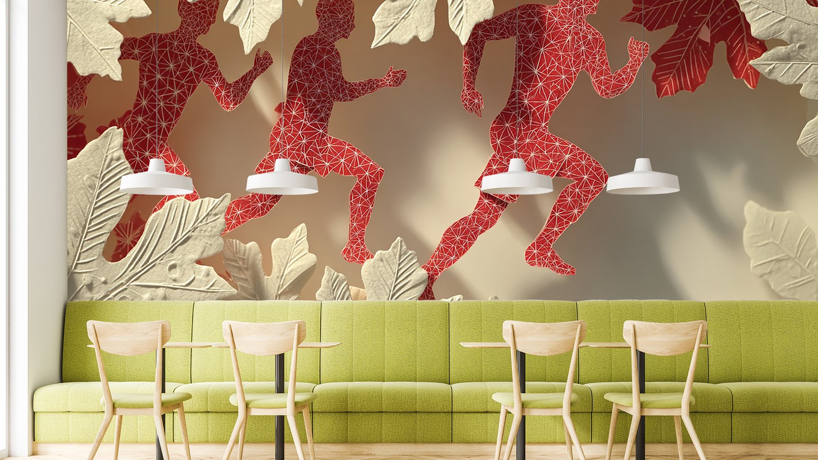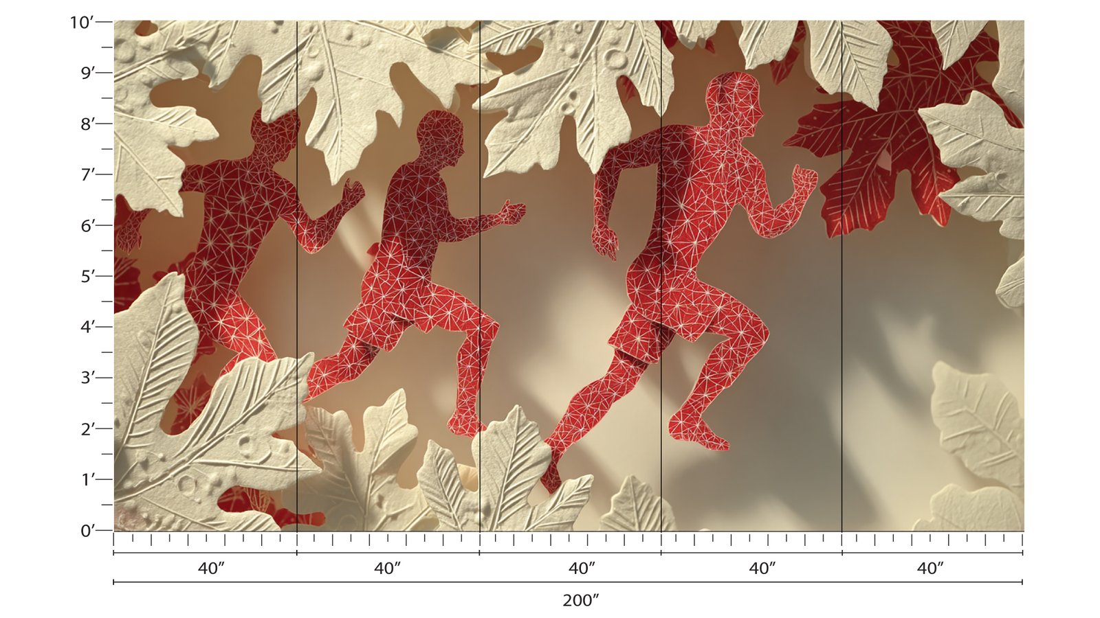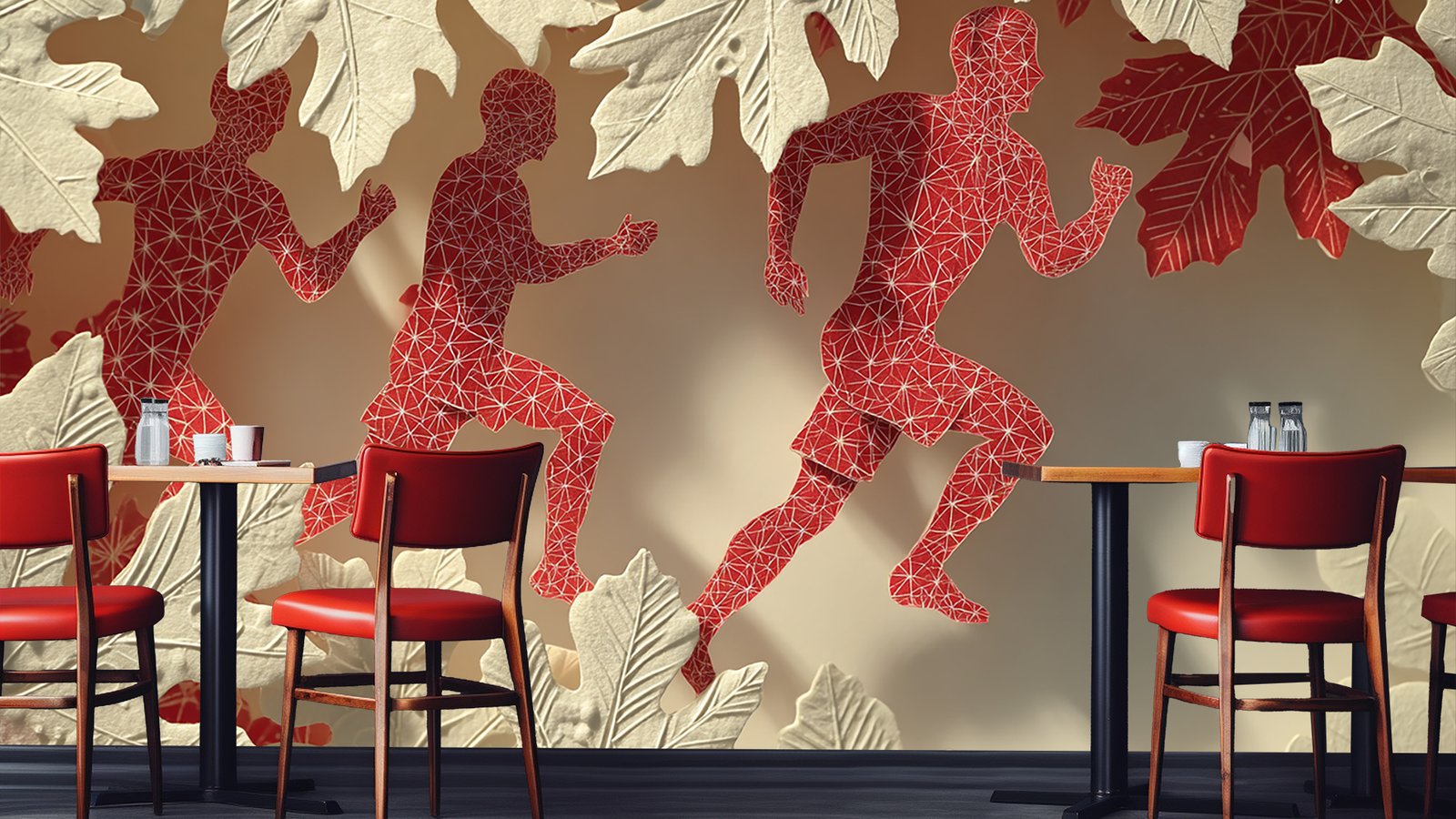 Abstract silhouettes of runners surrounded by decorative leaves