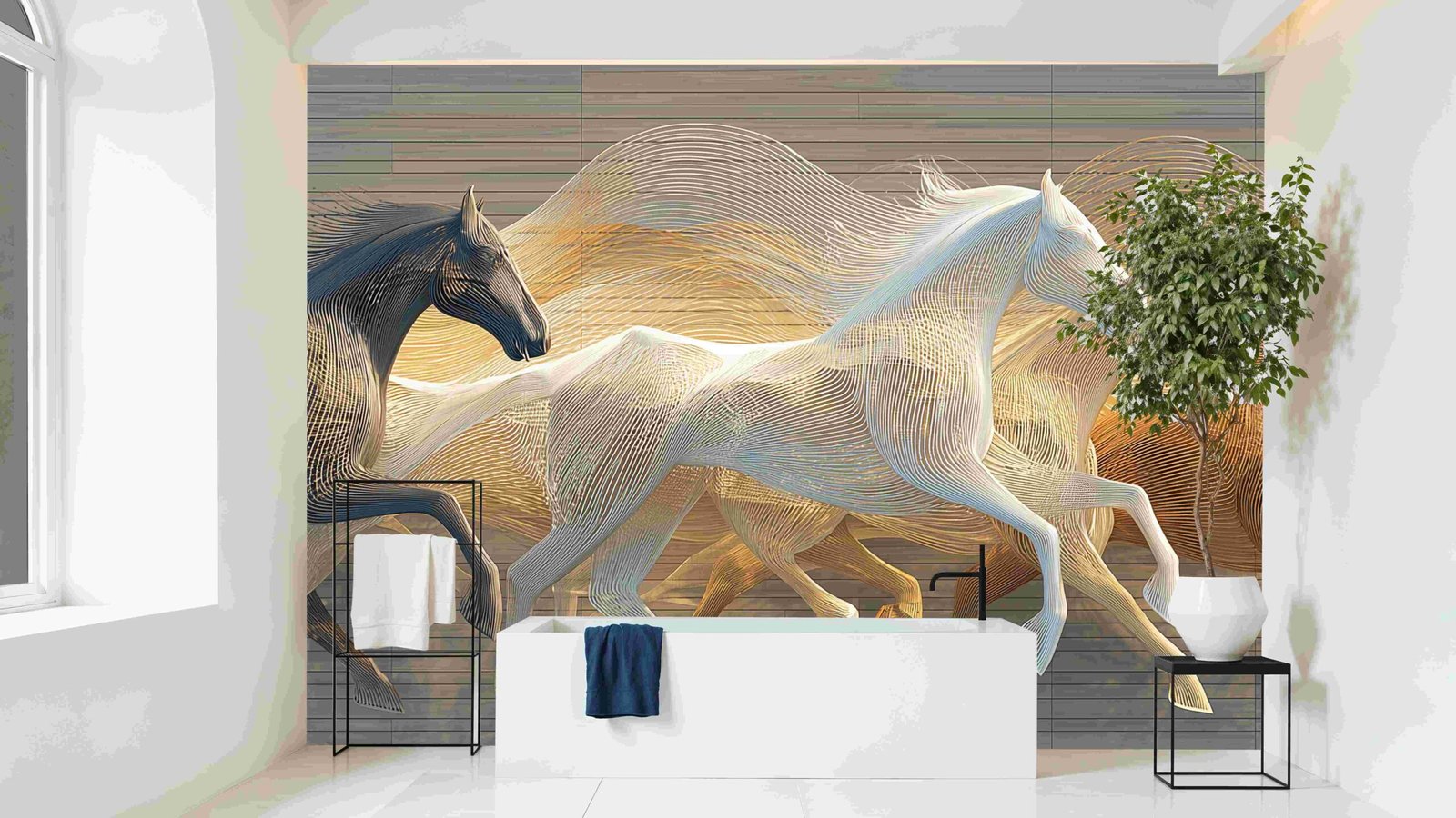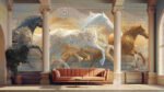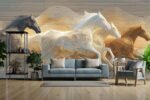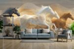 Four stylized horses in motion, featuring black, white, and brown colors with flowing lines against a light background.