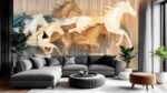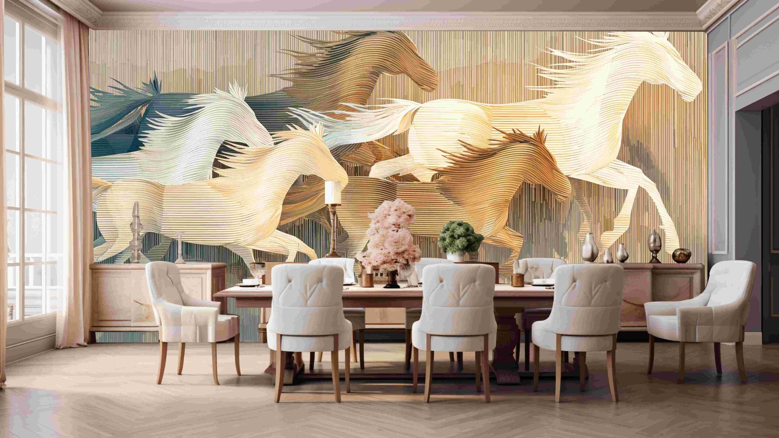 Five stylized horses in motion, featuring various shades of beige and blue with flowing manes.
