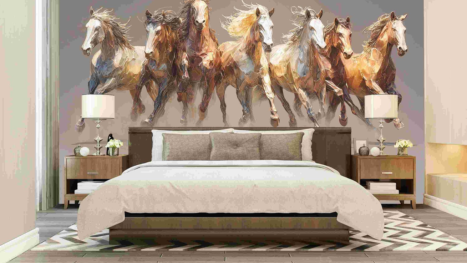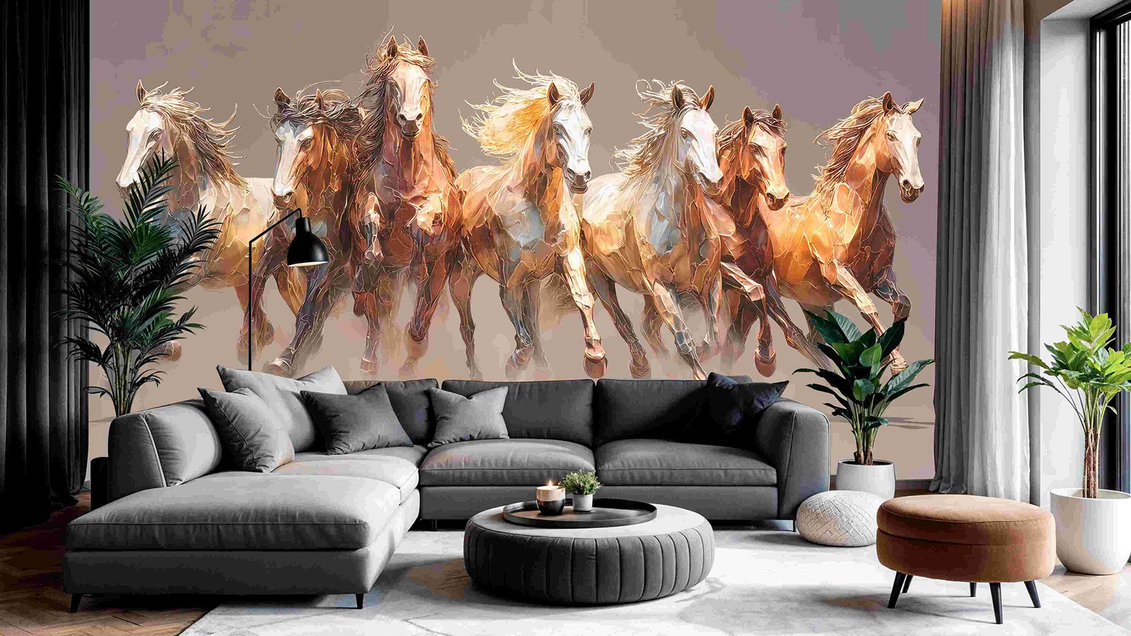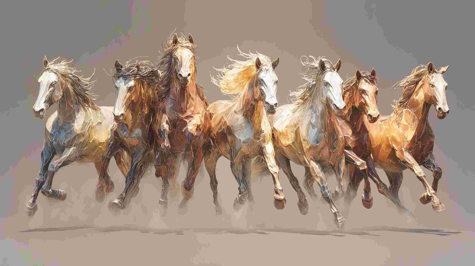 Seven horses galloping together, showcasing various colors and flowing manes against a neutral background.