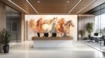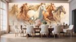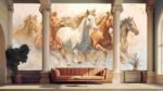 Five horses in motion, showcasing various colors and flowing manes against a textured background.