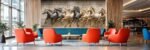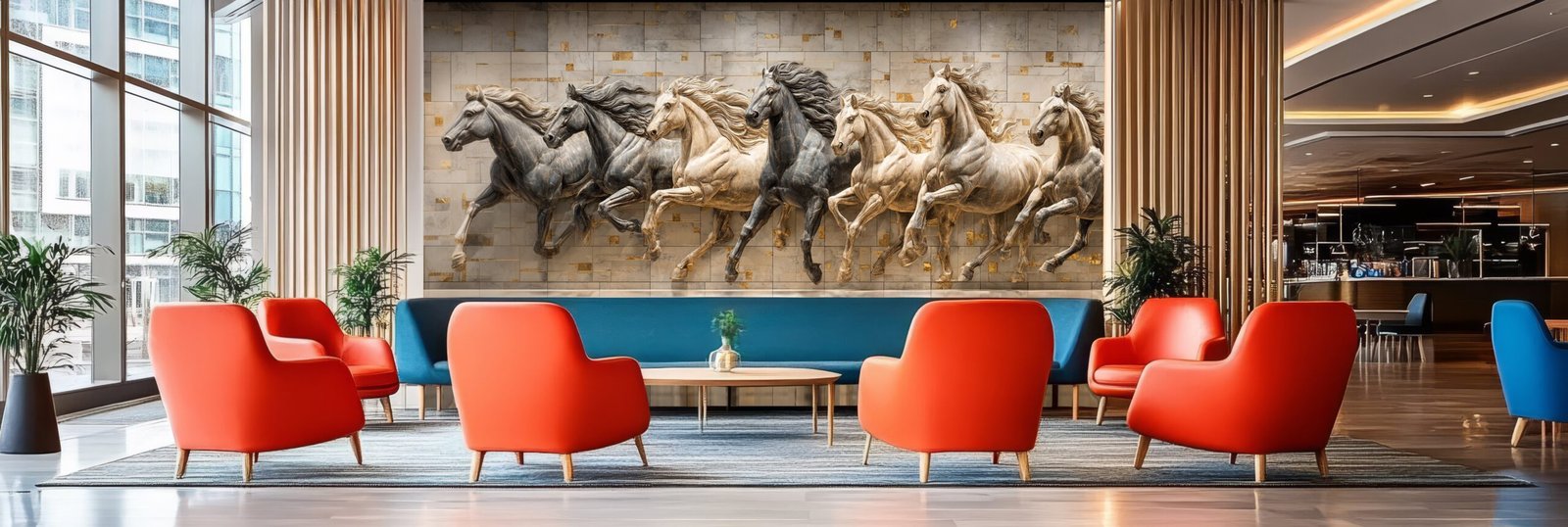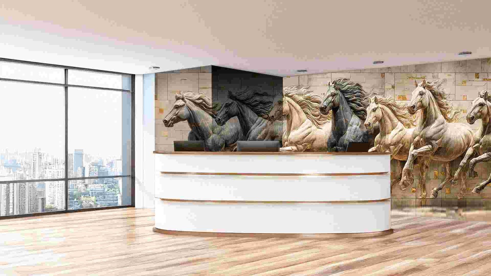 A decorative wall featuring seven horses in motion, sculpted with varying shades of gray and cream against a marble background.