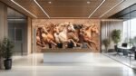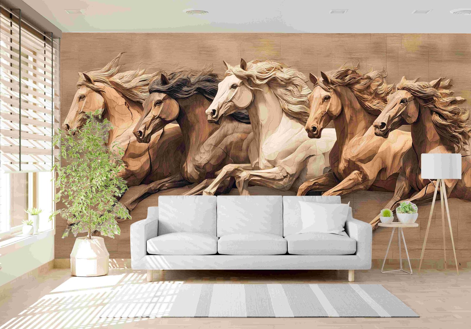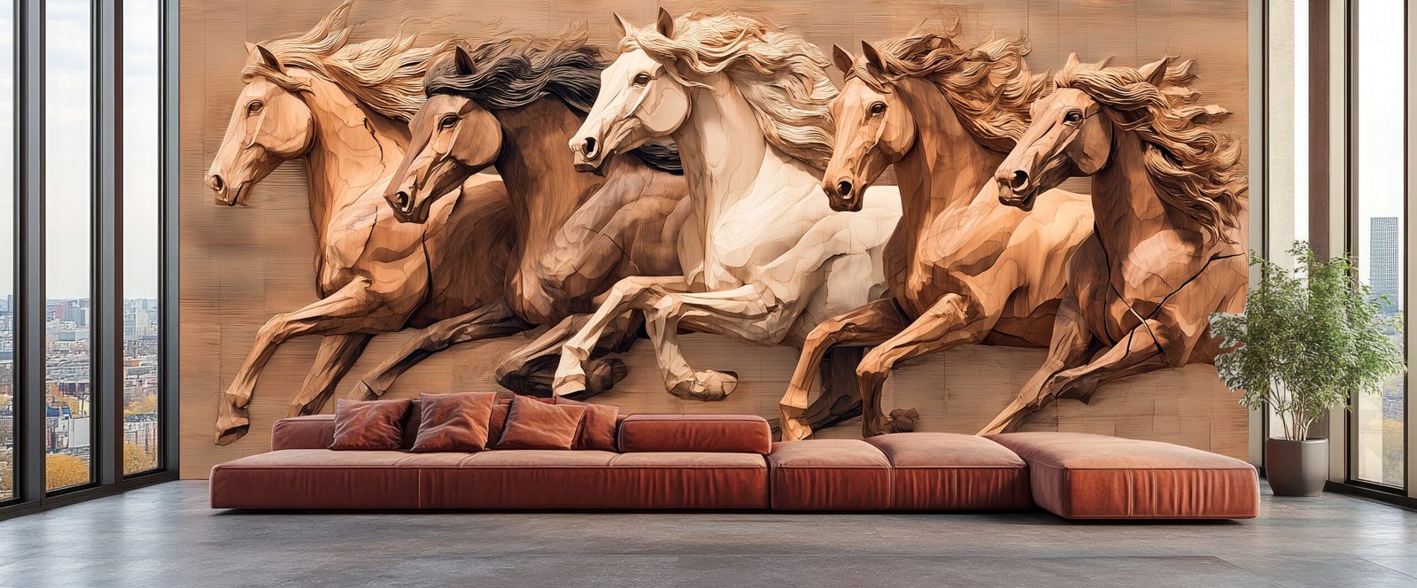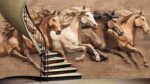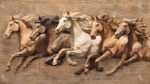 Five horses in motion with flowing manes, depicted in a wooden texture style.