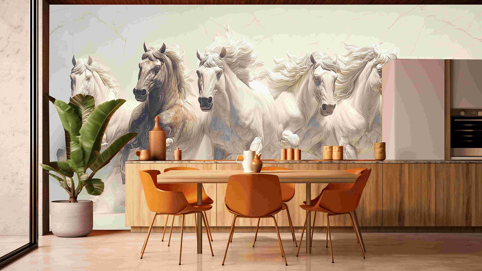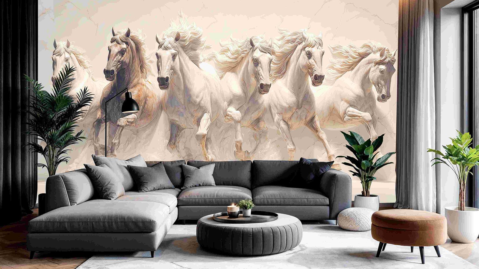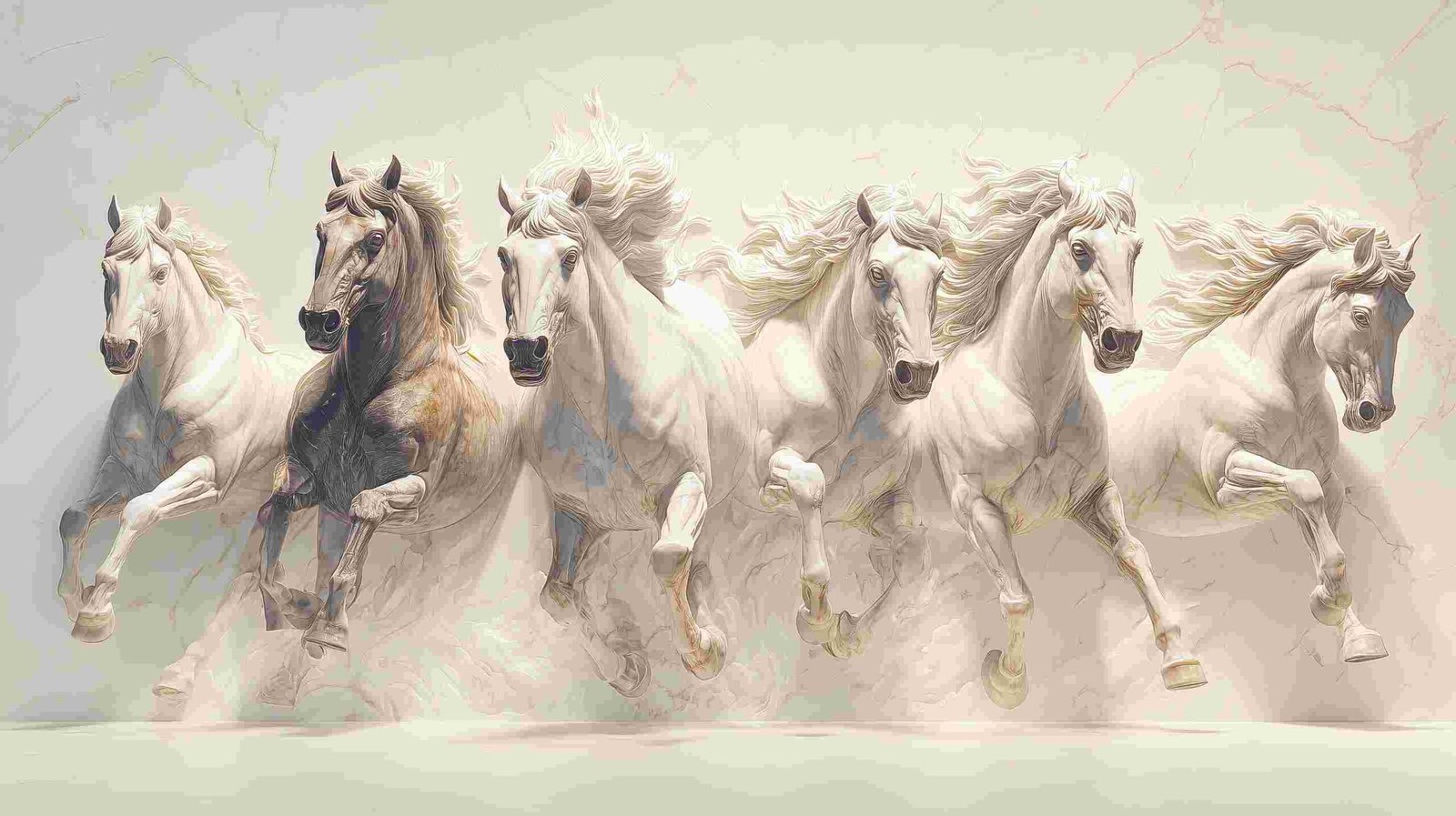 Five horses galloping, four are white and one is brown, with flowing manes against a light background.